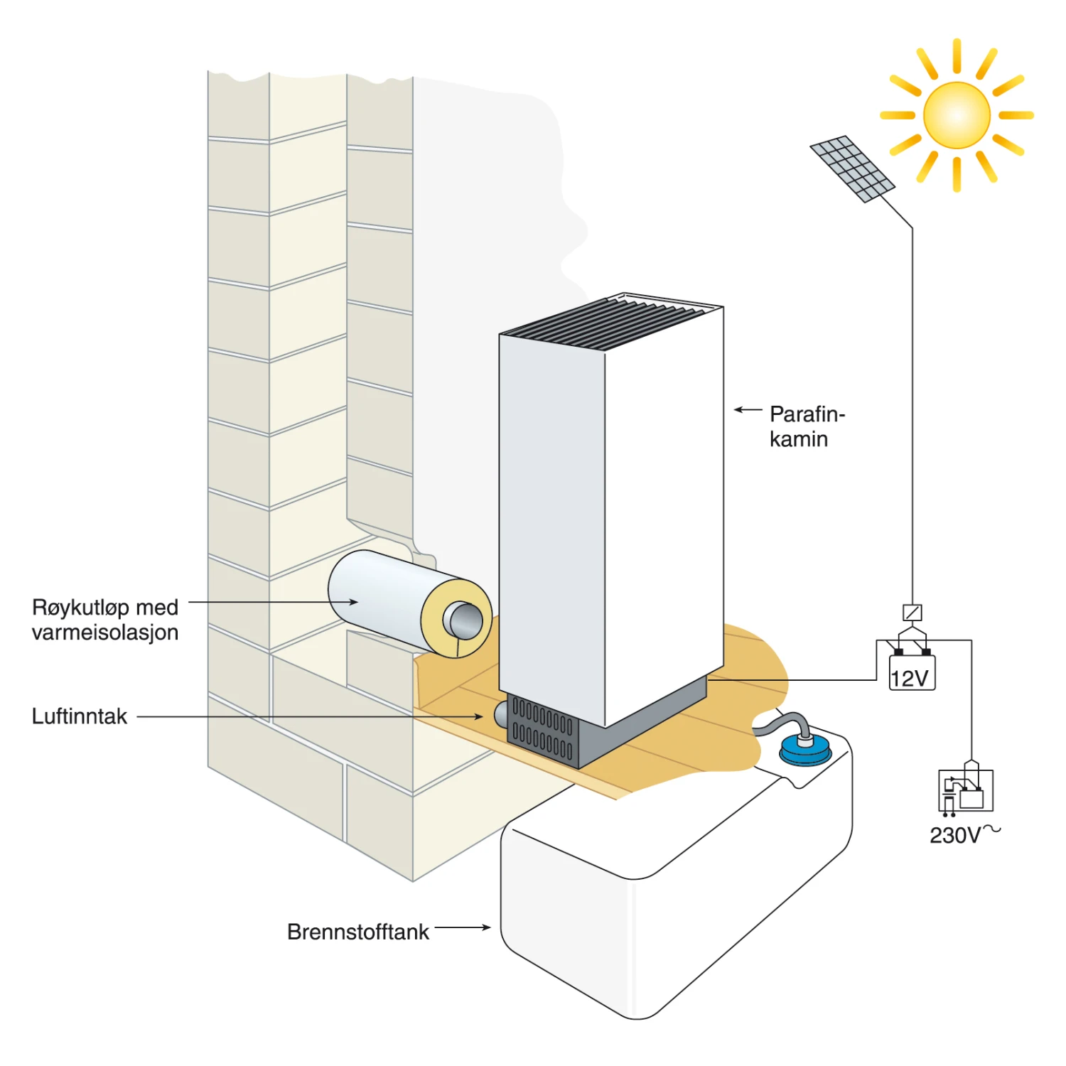 Wallas komplett kommer med: Wallas 40CC ovn, 33 liters tank med sokkel, monteringssett for pipemontering, og fjernstarter. Veggjennomføring kommer i tillegg.