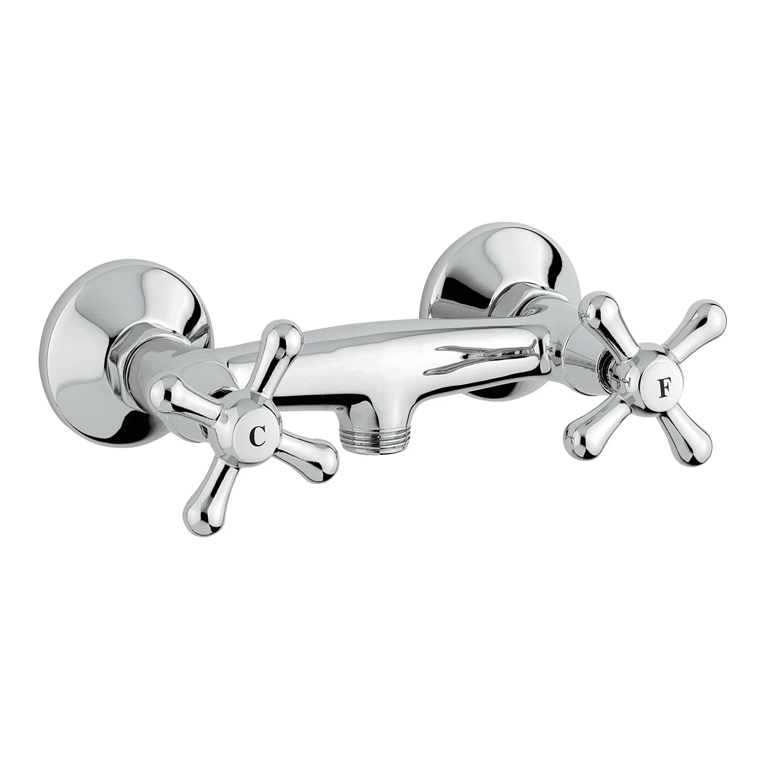 Stilfulle to-greps dusjarmatur for hytta. Nostalgisk design utført i rustfritt stål. Sintef-godkjent.