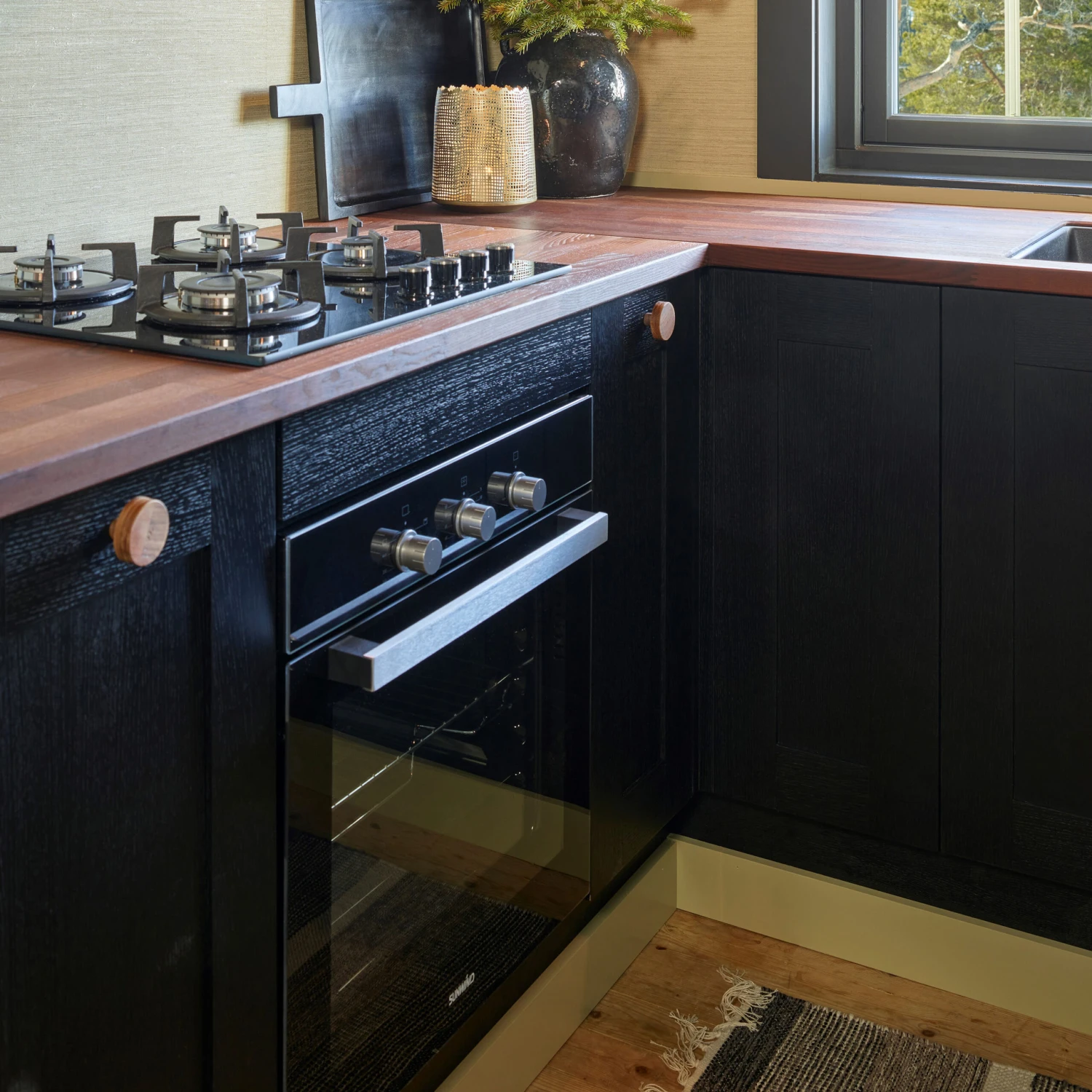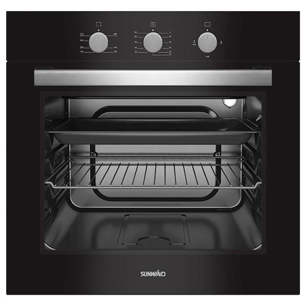 Chef er en lekker innbyggingsovn på gass med front i sort glass. Dobbel dør og håndtak/brytere i rustfritt stål.