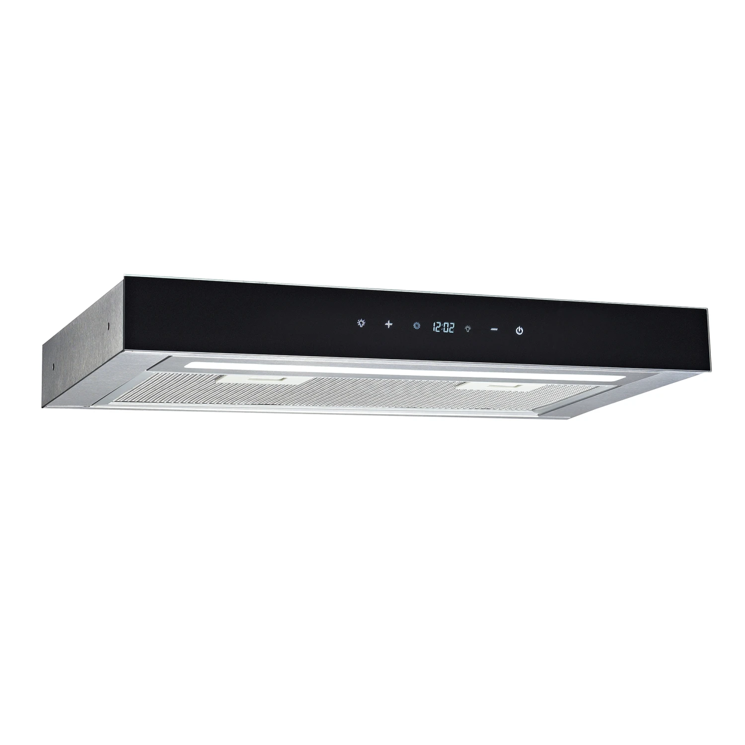 Elegant touch-kontroll med LCD-display i front. Det medfølger en LED-lyslist integrert i viften. Viften har doble viftemotorer og aluminiumsfilter. Lydnivå 53 db.