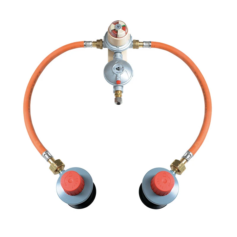 Omkaster automatisk veksler automatisk mellom to gassflasker når den første går tom. Passer til husholdningsflasker.