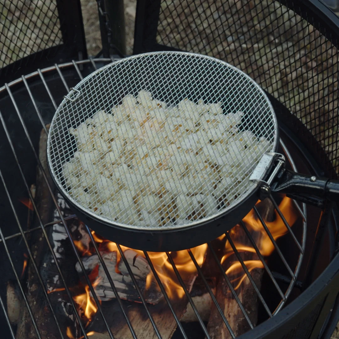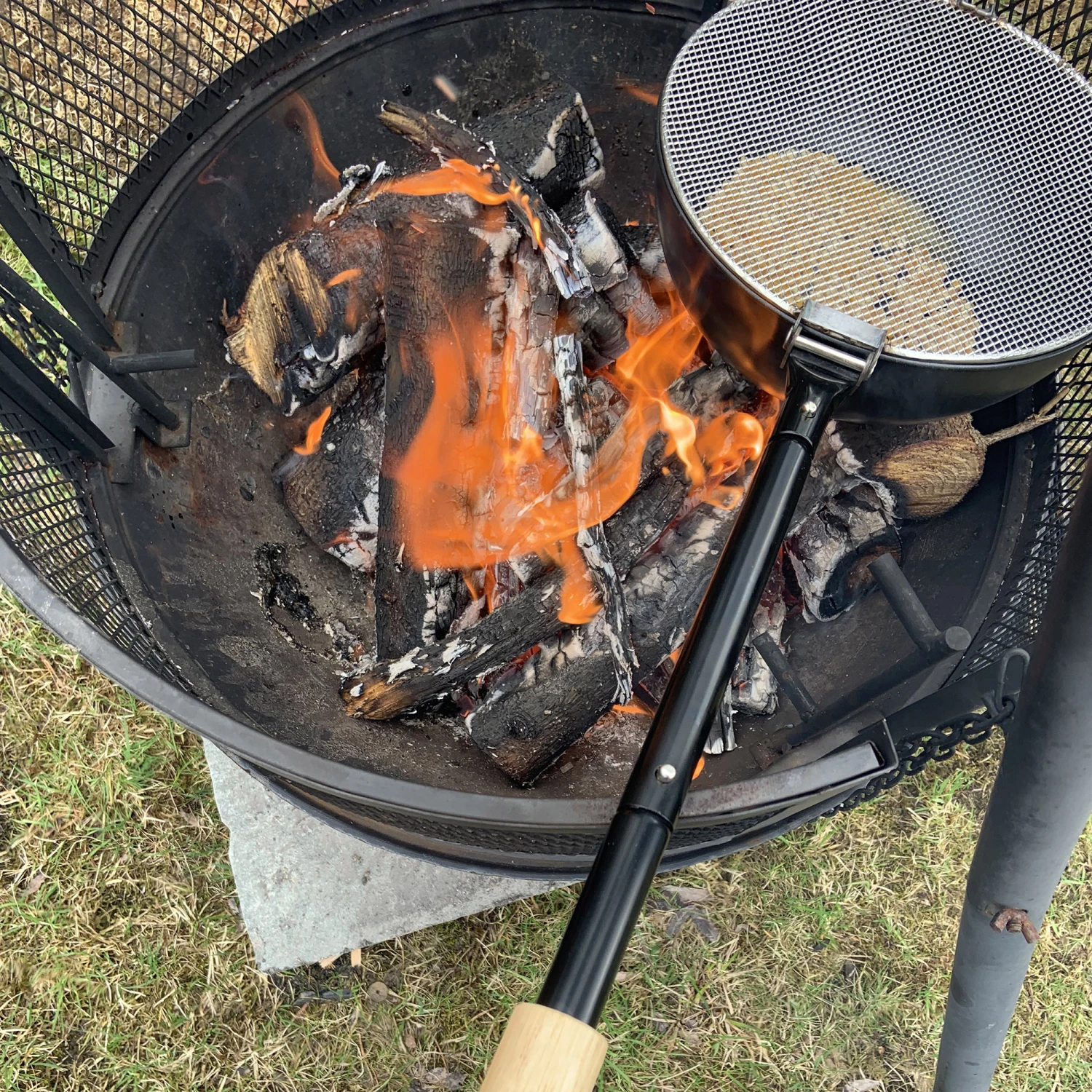 Sprettkønndigel er en praktisk popkorngryte som er perfekt til bruk over bålet. Skaftets lengde kan justeres, slik at den er enkel å ha med på turen!