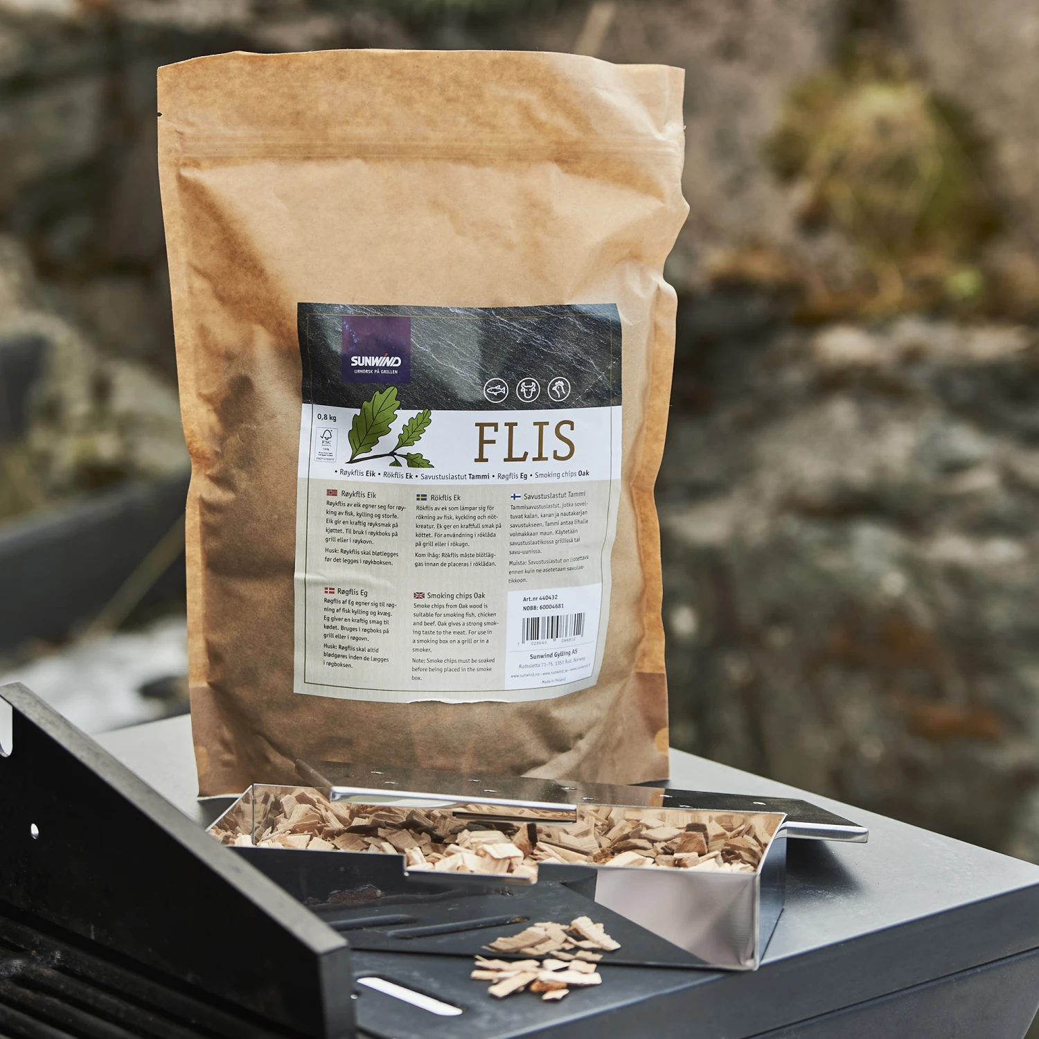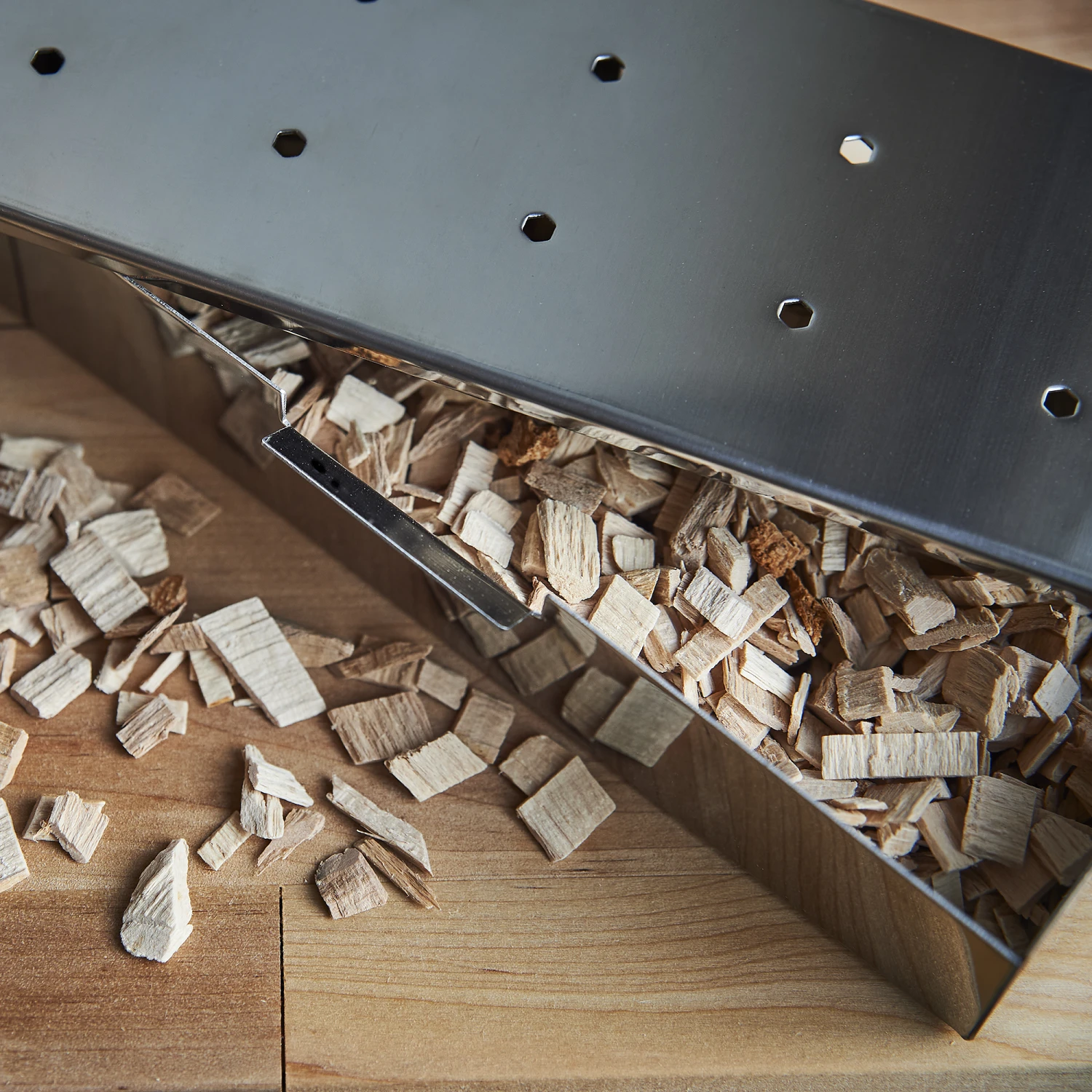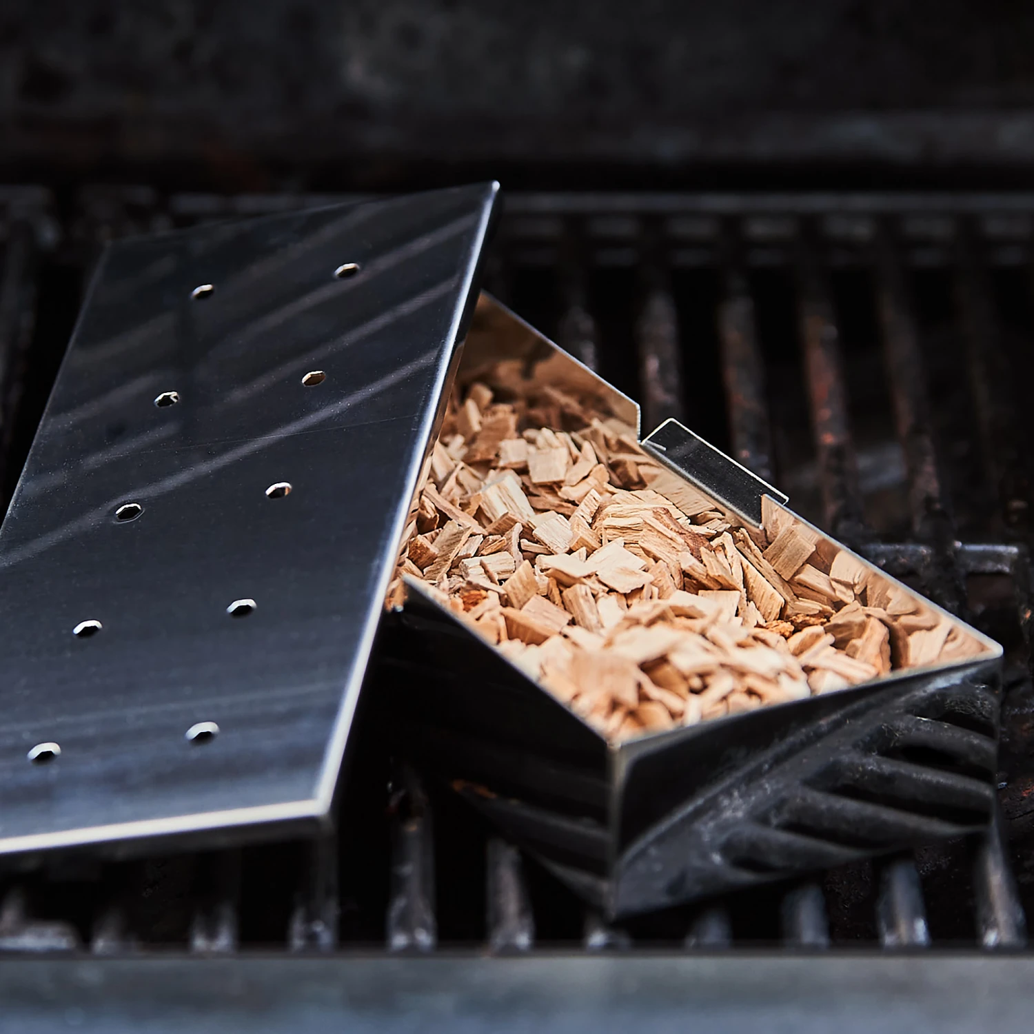 Fyll boksen med bløtlagt røykeflis og plasser på grillristen. Røykflis finnes i en rekke smaksvarianter, og avgir røyk som smaksetter maten.