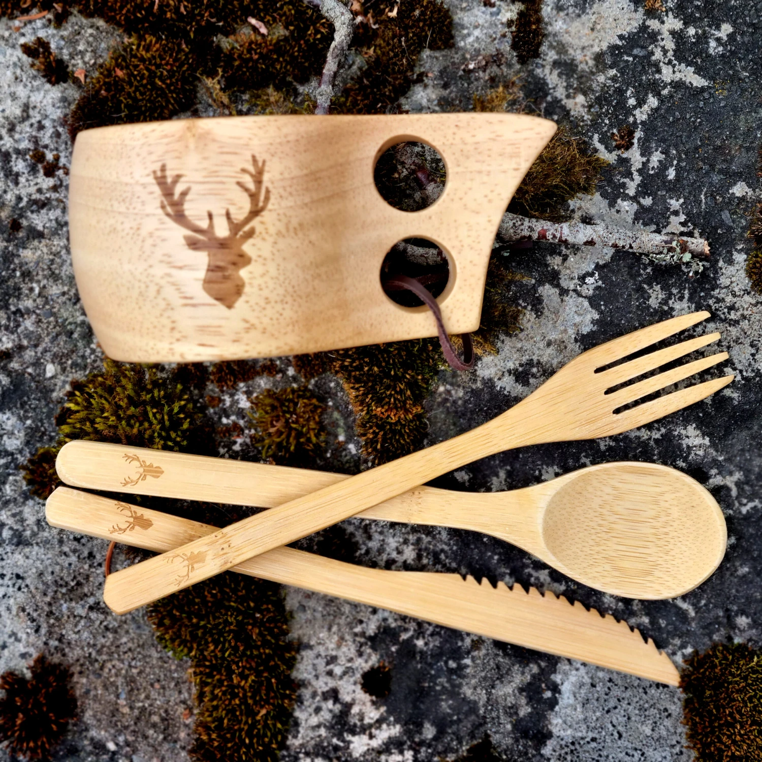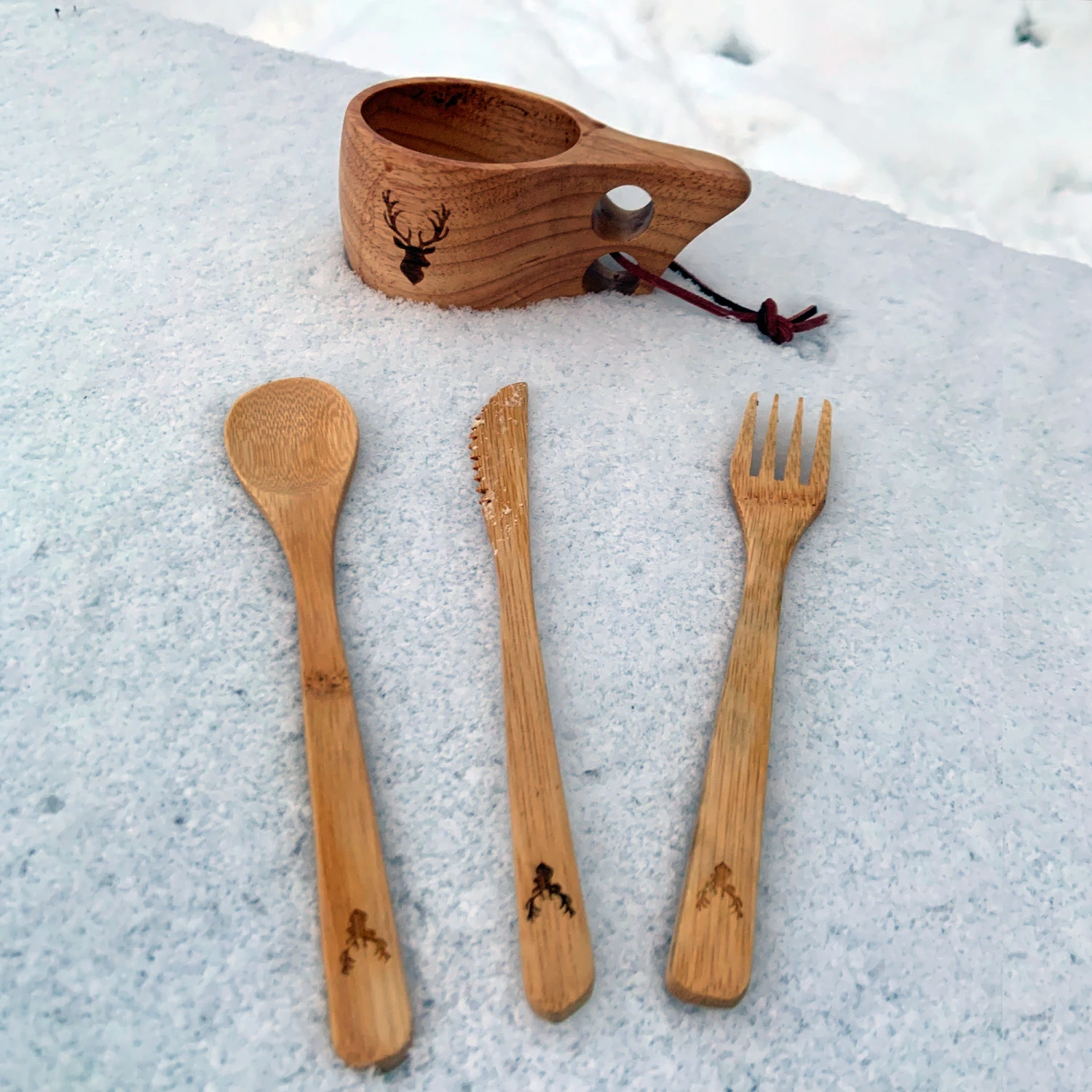 Bestikksett i tre med Bergtora-trykk. Perfekt å ha med seg på turen, eller når du sitter rundt bålpannen.