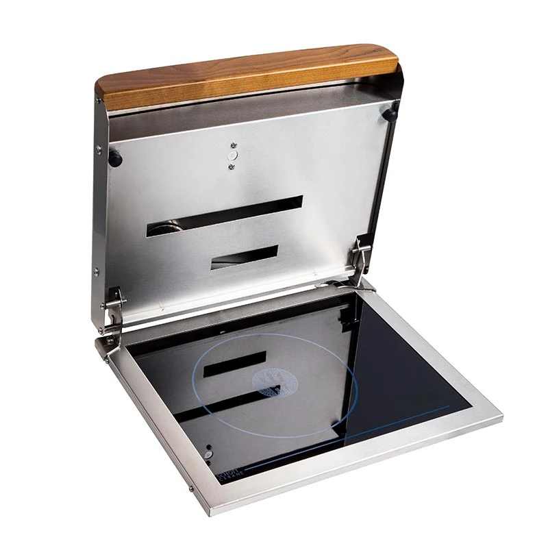 Enheten fungerer som en komfyr når lokket er oppe, men når lokket er lukket aktiveres den innvendige viften og blåser varmen fra brennerne inn i kabinen.